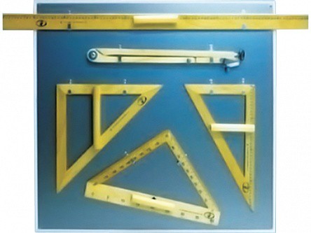 Раздел 2. Комплекс оснащения предметных кабинетов, Подраздел 1. Кабинет начальных классов, 2.1.24. Комплект чертежного оборудования и приспособлений для школьной доски (треугольник, транспортир, циркуль, линейка)