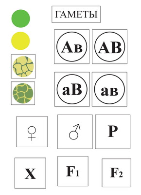 Пособие представляет собой набор карточек прямоугольной, квадратной формы. К ним прилагается набор магнитов, с помощью которых карточки крепятся к доске. Пособие позволяет смоделировать на доске опыт Г. Менделя по скрещиванию двух сортов гороха – с желтыми гладкими семенами и зелеными морщинистыми. По этой схеме можно проследить наследование того или иного признака, не связанных между собой генетически, а также усвоить разницу между понятиями «генотип» и «фенотип».