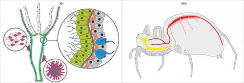 1) Пищеварительную (зеленый, пищеварительные железы выделены коричневым), дыхательную (голубой) и мочеполовую системы (органы выделения – розовые, репродуктивные органы – фиолетовые).