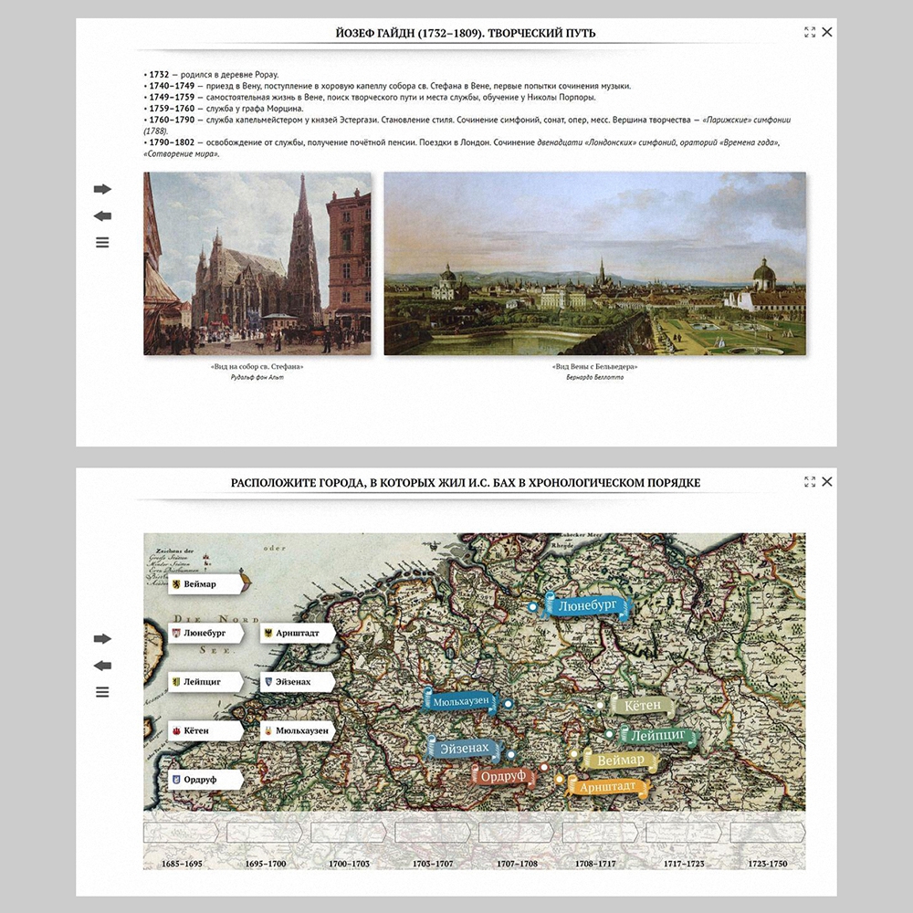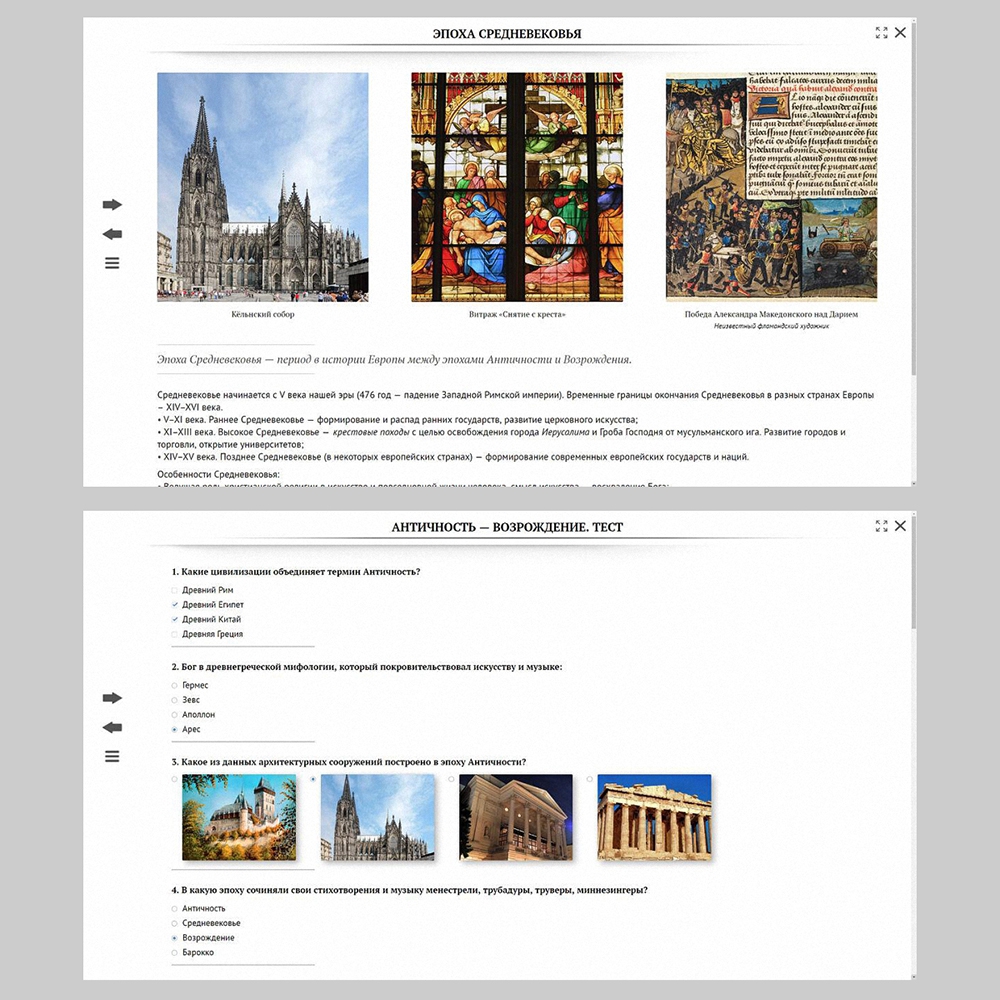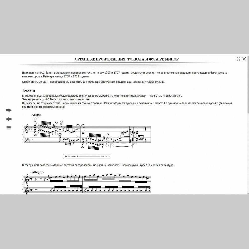 Пособие включает в себя текстовые, нотные, иллюстративные, аудио- и видеоматериалы, различные виды интерактивных заданий, викторины и тесты с функцией проверки допущенных ошибок.