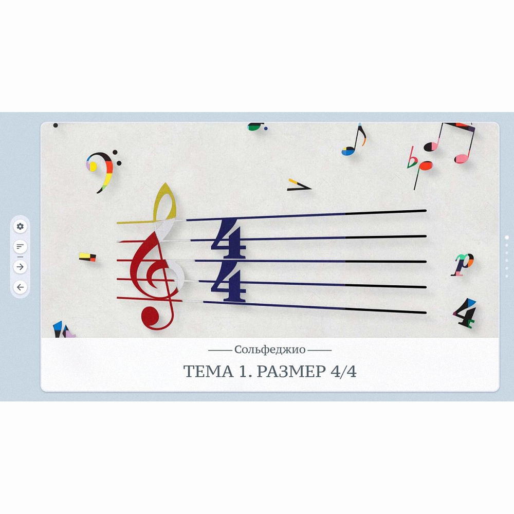 - интерактивные элементы (нотный стан, клавиатура, метроном) и задания;