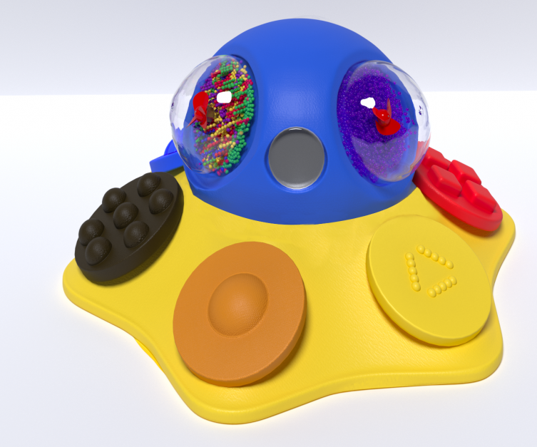 Игра «Настольный текстурированный тактильный центр» предназначена для детского общего развития и развития детей, имеющих проблемы со зрительным, тактильным, слуховым восприятием и коммуникацией. Представляет собой корпус сложной формы с текстурированными кнопками и прозрачными куполами, в каждом из которых есть вентилятор и лёгкие шарики или блестки разных цветов. Изготовлено из высококачественного ударопрочного пластика, имеет обтекаемые плавные формы без острых краёв и углов.