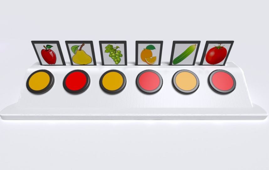6-ти кнопочный игровой коммуникатор со вставкой предназначен для развития детей, имеющих проблемы с визуальным, слуховым восприятием и коммуникацией. Представляет собой корпус сложной формы, на котором расположены 6 жёлтых и красных кнопок с контрастным чёрным контуром для лучшего визуального восприятия и прозрачные кармашки для вставки картинок. Имеется функция записи сообщений, общее время записи – 54 минуты. Устройство изготовлено из высококачественного ударопрочного пластика, имеет обтекаемые плавные формы без острых краёв и углов.