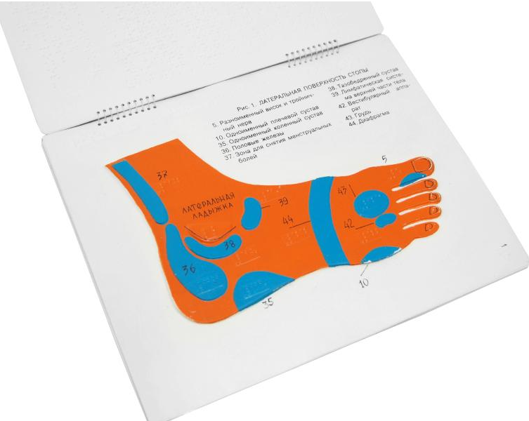 Пособие содержит рельефное и плоскопечатное изображения стоп человека с выделенными  активными зонами, посредством которых можно воздействовать на физическое состояние человека. Рисунки содержат пояснения.