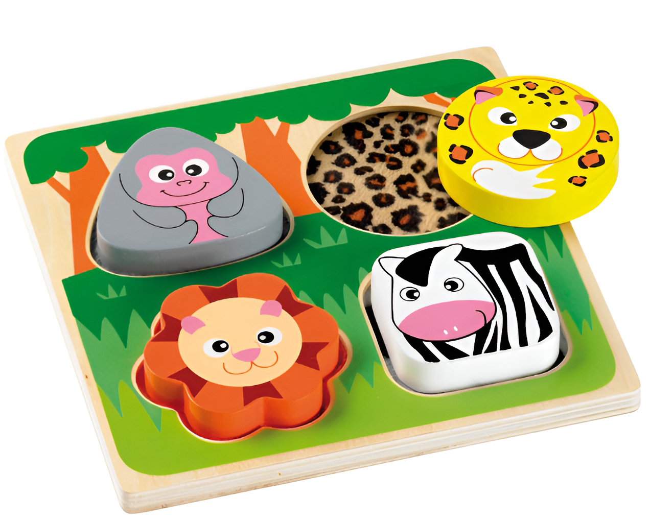 Тактильные пазлы для незрячих и слабовидящих детей. Сами пазлы выполнены из дерева. А места, куда пазлы вставляются, выполнены из различных на ощупь материалов.