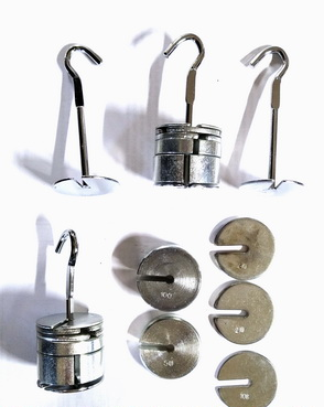 Грузы изготовлены из металла в форме дисков, каждый диск промаркирован по массе 3 шт. по 100г, 3 шт. по 50г, 6 шт. по 20г, 3 шт. по 50г, плюс стержень с грузом и крючком 20г 4 шт.