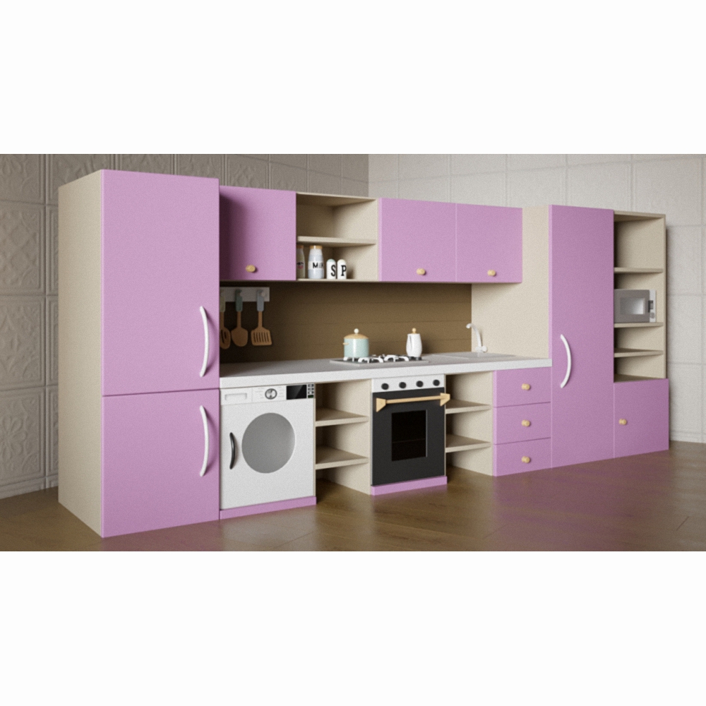 Кухня «Лаванда» оснащена всем, что можно встретить на настоящей взрослой кухне – бытовая техника, столешницы, полочки, шкафчики и ящички. Фасад изготовлен из высококачественного материала и окрашен в оттенок лаванды с минималистичными акцентами белого цвета.