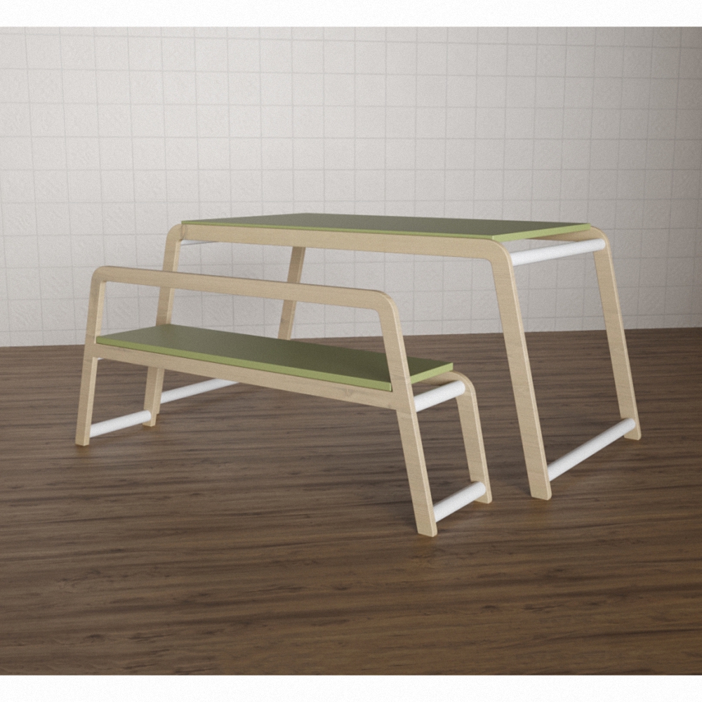 Детский стол “Моя первая парта” нужен для групп в ДОУ, подойдет также для занятий в начальных классах, коррекционных и развивающих центрах. Он имеет очень простую конструкцию - состоит из 4-х находящихся под оптимальным углом наклона ножек (соединенных перекладинами попарно для большей надежности) и столешницы формы прямоугольника. Весь модуль имеет цвет натуральной древесины, кроме столешницы – она окрашена в спокойный зеленый цвет. За ним можно разместить 1-2 ребёнка. К столу такой конструкции можно подобрать подходящую по исполнению скамейку.