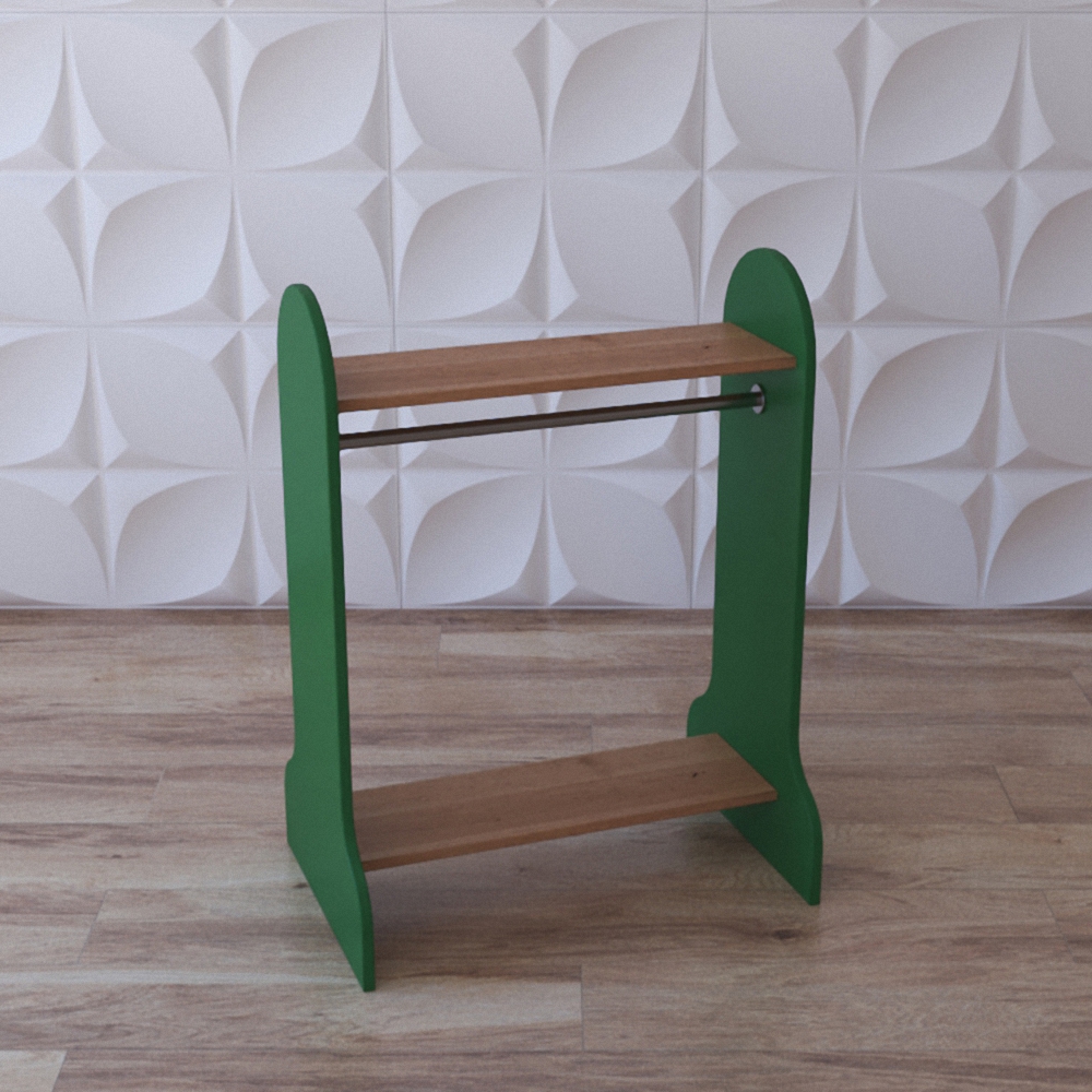 Вешалка напольная представляет из себя модуль из натуральной древесины, боковые панели окрашены в зелёный цвет либо цвет натуральной тёмной древесины; в составе модуля есть 2 деревянные полочки и металлическая штанга для вешалок-плечиков. Вешалка напольная детская может выступать в качестве игрового модуля для игровых групп в садиках и яслях.