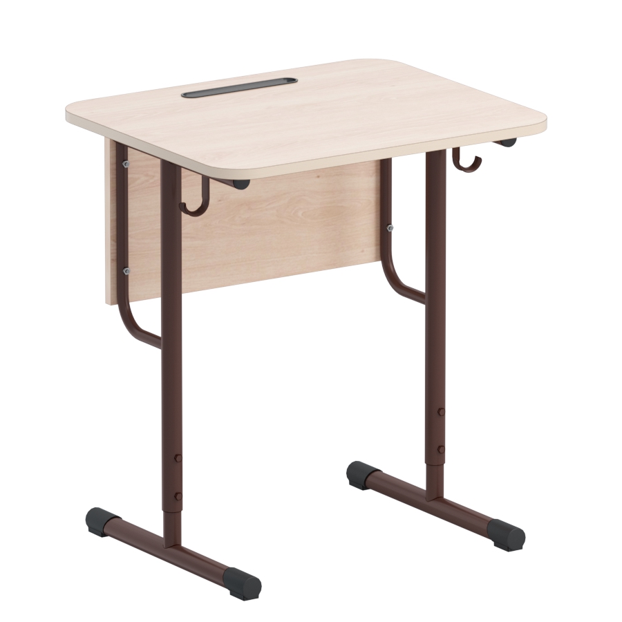 Изготавливается на металлическом каркасе круглого сечения, окрашенном полимерно-порошковой краской, стойкой к химическим и механическим воздействиям, на свободных концах труб установлены заглушки из ударопрочных полимеров. Столешница и передняя панель выполнены из ламинированной ДСП 16 мм, торцы столешницы облицованы кромкой ПВХ 2 мм. На рабочей поверхности имеются выемки для ручек, карандашей и других принадлежностей.