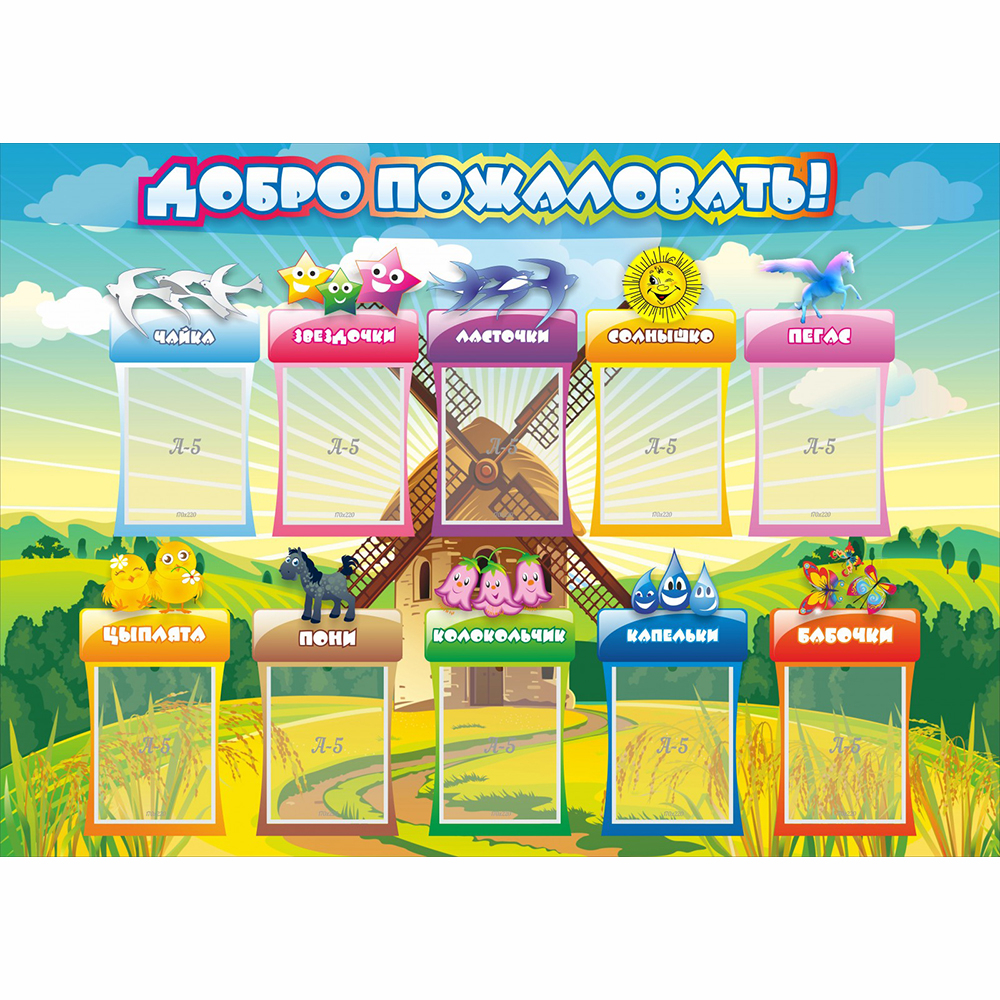 Стенд «Добро пожаловать» украсит холл при входе в детский садик и познакомит с группами, которые в нем занимаются. В качестве фона дизайнерами выбрана тематическая картинка мельницы и бескрайних полей.