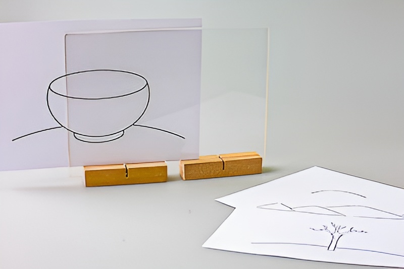 Рабочая поверхность мольберта изготовлена из акрилового стекла и вставляется в подставки из натурального бука. Подставки позволяют его использовать в вертикальном, горизонтальном положении, а также параллельно рабочей поверхности стола.