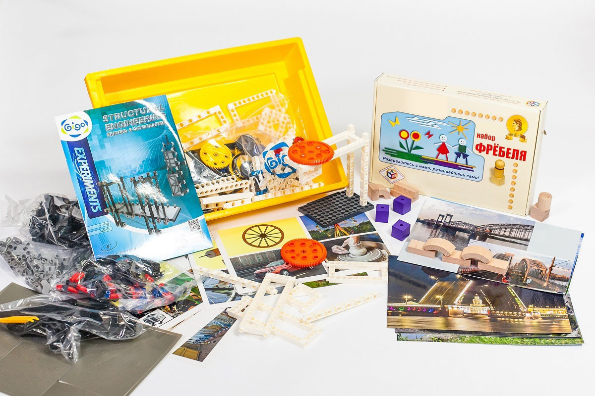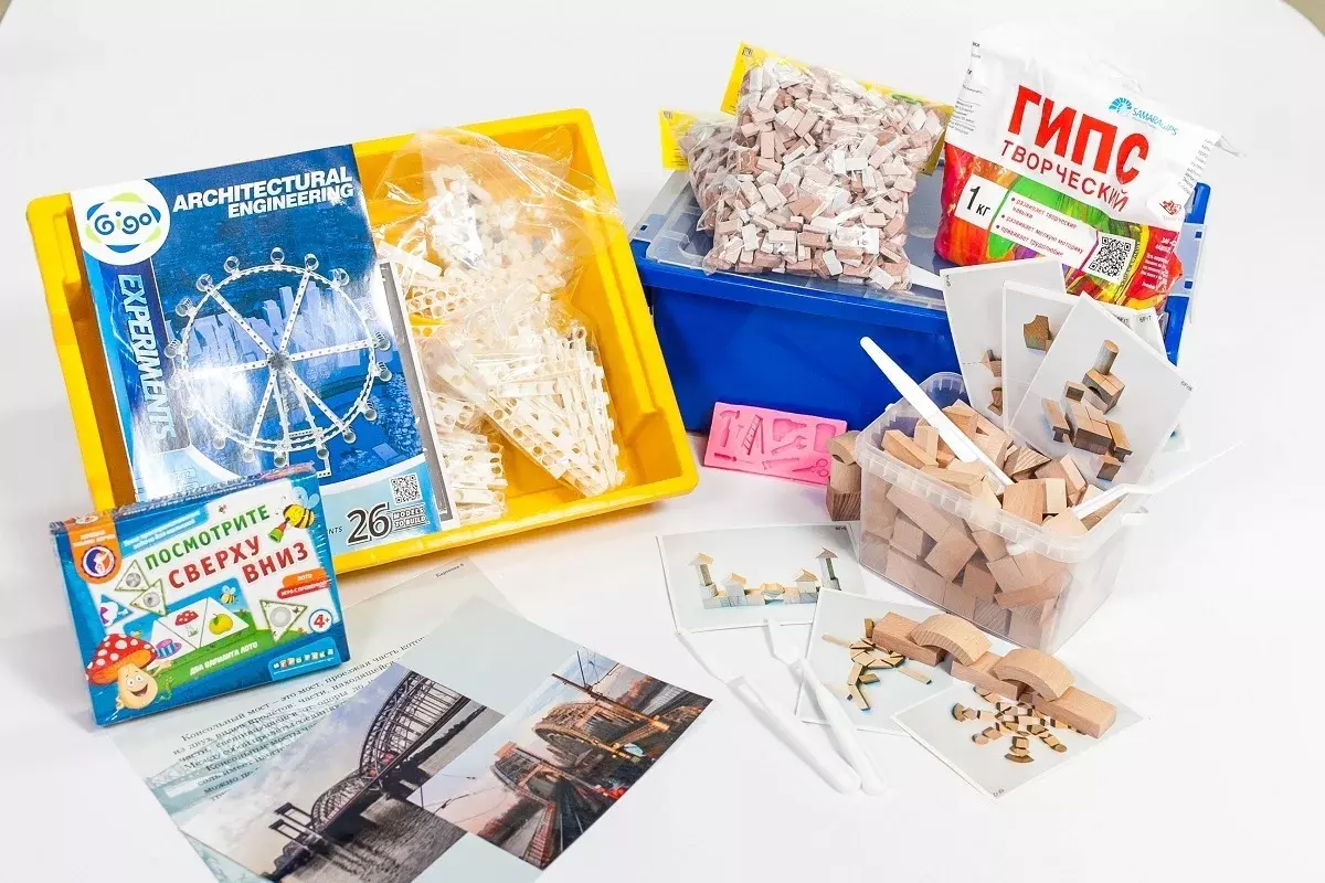 - Комплект № 1 «Архитектура». В комплект входят элементы для конструирования из различных материалов: дерево, пластик, бумага, карточки-схемы, набор инструментов «Юный архитектор», видео-контент, журнал проекта.