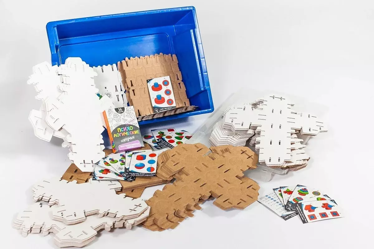 • Комплект № 1 «Моделирование». В комплект входят набор для создания 3D-моделей, карточки с заданиями на сложение, вычитание, пересечение, видео-контент, журнал проекта.