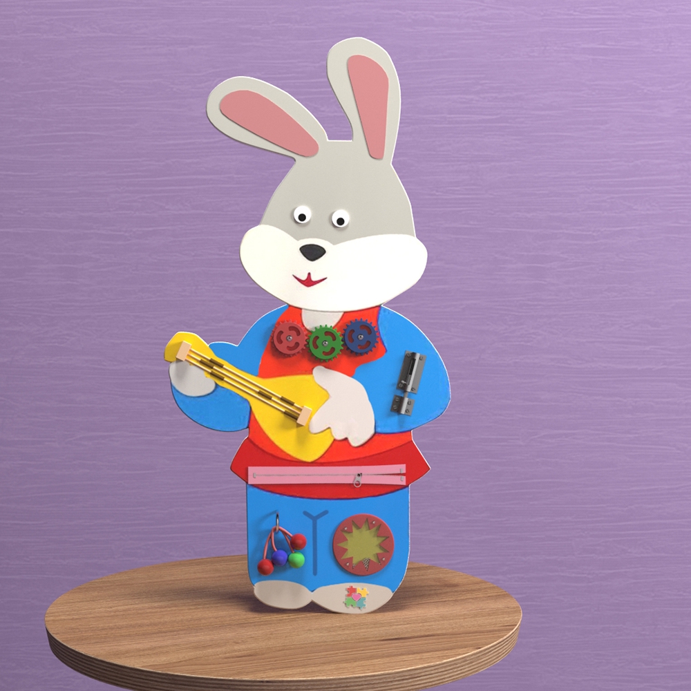 Бизиборд – игровой модуль для раннего развития детей от одного года с высокой игровой ценностью. Бизиборд в виде зайчика №1 - одна из моделей, которая крепится к стене. Основа изготовлена в виде фигуры сказочного Зайки с балалайкой, на которой размещены разнообразные приспособления для детской игры. Все края закруглены и обработаны по специальной технологии, что гарантирует безопасность в использовании даже самыми маленькими детками.