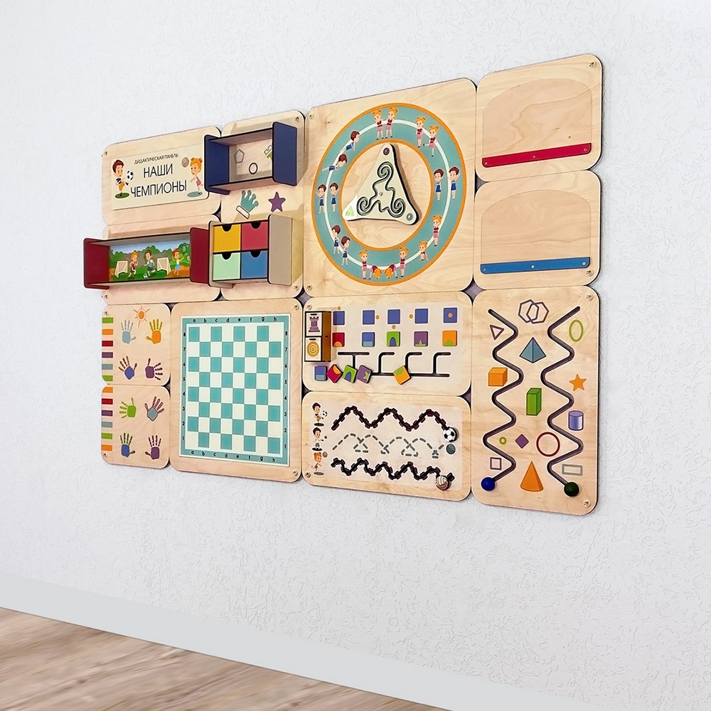 Дидактические панели отлично дополняю наборы цветных и иллюстрированных стеновых панелей, которые позволят оформить всё помещение в едином стиле.