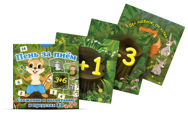 Сюжет игры. В лесу появился таинственный житель. Чтобы узнать, кто это, ребенок должен добраться до него по пенькам. Каждый «пенек» — это карточка с примером на сложение или вычитание. Загадочный приз в конце игры мотивирует детей посчитать все примеры до последнего «пенька».