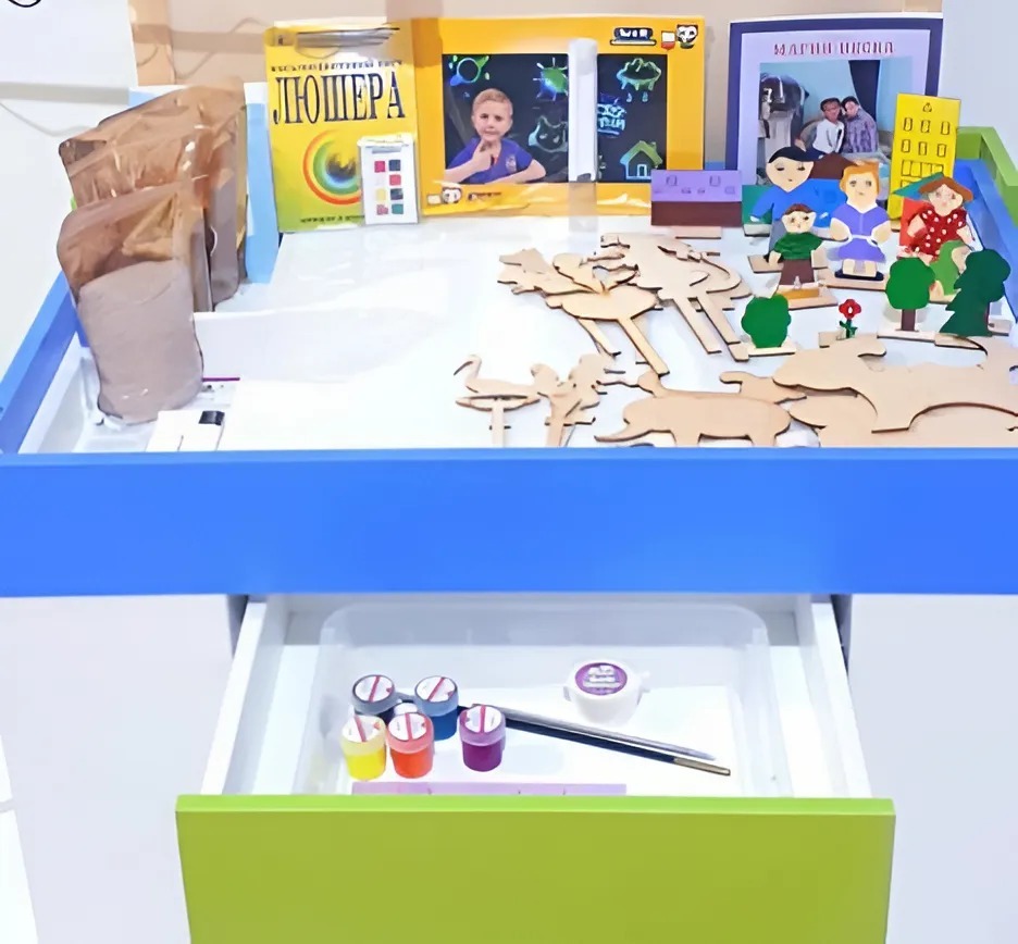 Технические полости модуля предназначены для хранения комплектующих и расходных материалов, которые входят в комплект. Это обеспечивает удобство использования и организацию рабочего пространства. Все необходимые инструменты и материалы, такие как кисти, краски, песок и другие, всегда под рукой, что позволяет детям сосредоточиться на творчестве и не отвлекаться на поиск нужных предметов.