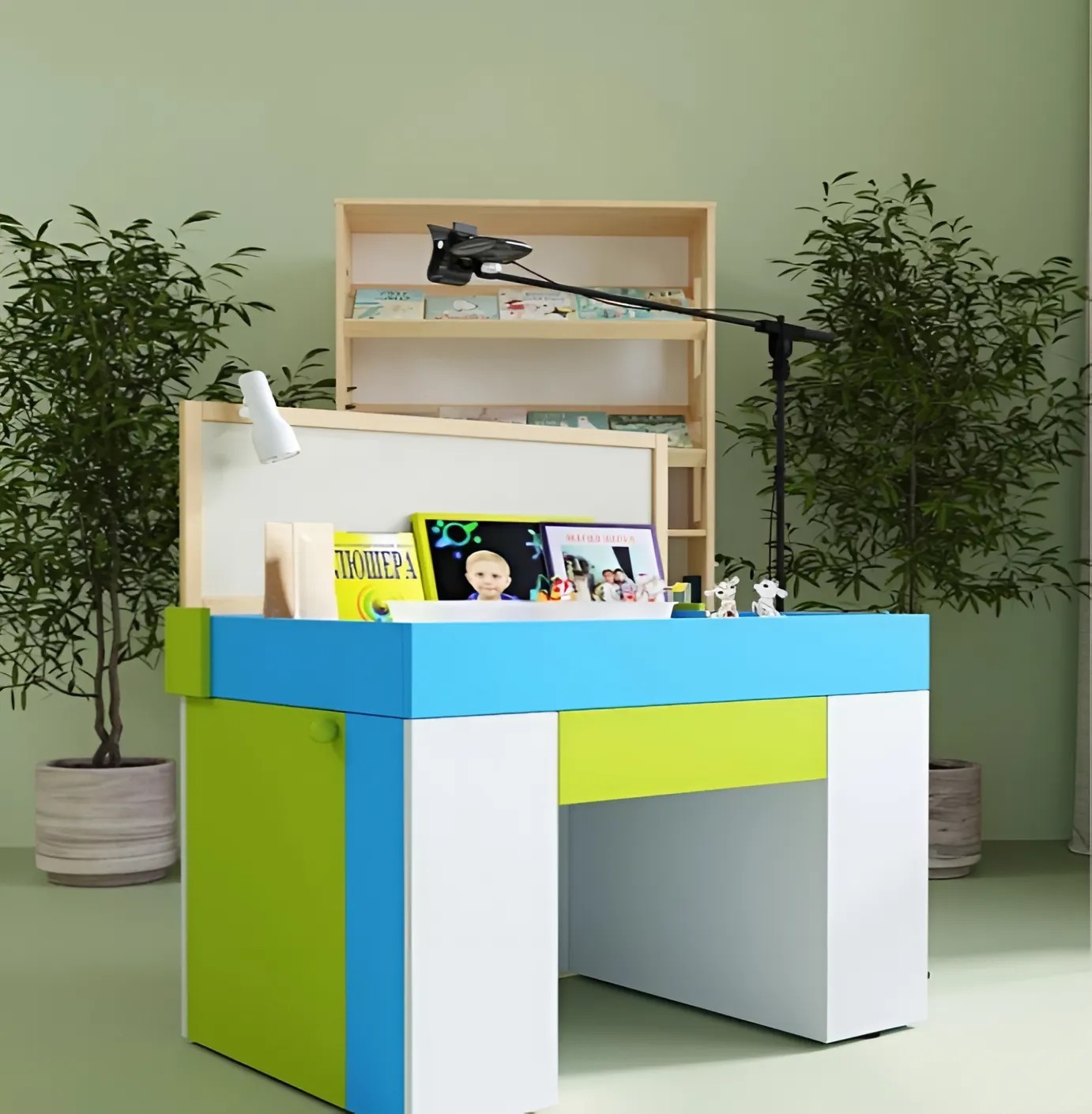 - Яркий и привлекательный внешний вид. Корпус выполнен в стильных цветах (синий, лайм, белый), что делает мастерскую привлекательной для детей.