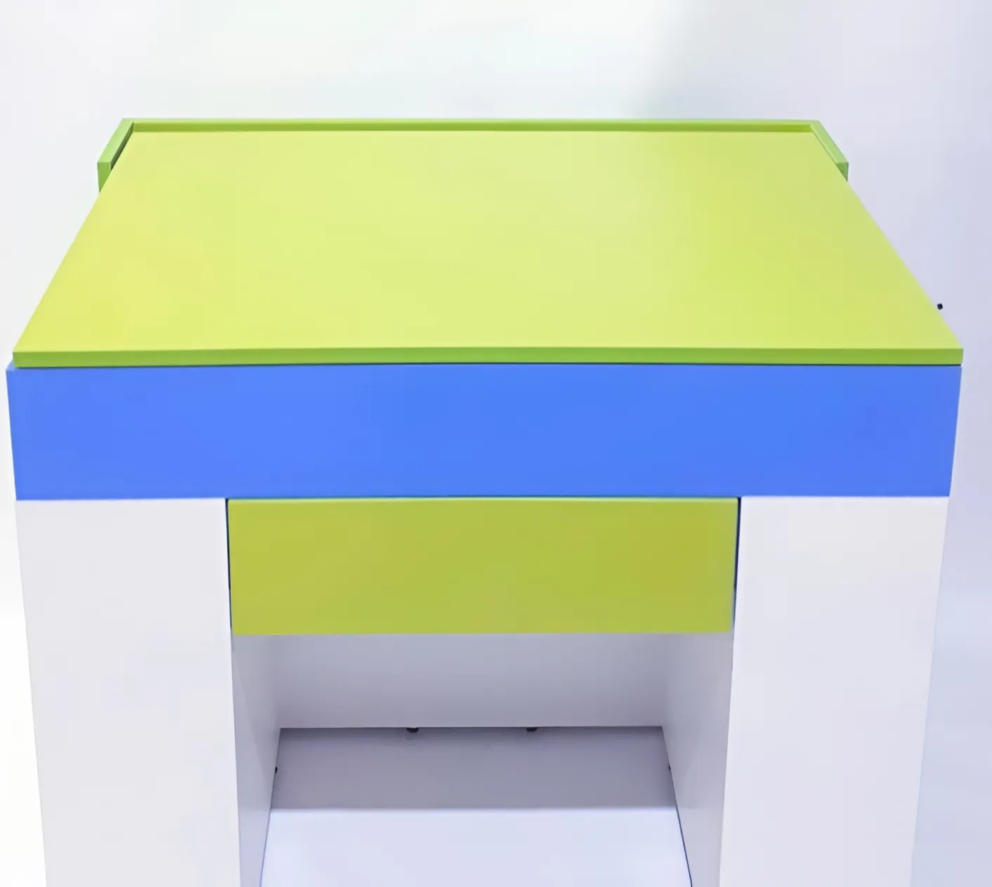 Основной элемент этой мастерской - рабочая область для рисования песком. Она представляет собой световое поле с отсеком для песка, которое полностью закрывается откидной крышкой. В закрытом состоянии крышка превращается в столешницу, на которой можно работать, как на обычном столе. Это позволяет детям использовать пространство эффективно и комфортно.