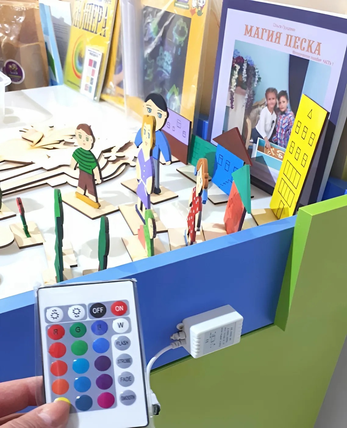 - Разнообразие творческих материалов. Комплект включает технику эбру, набор для песочного рисования, театр теней, сценарии сказок и аксессуары для рисования, что даёт широкий простор для занятий.