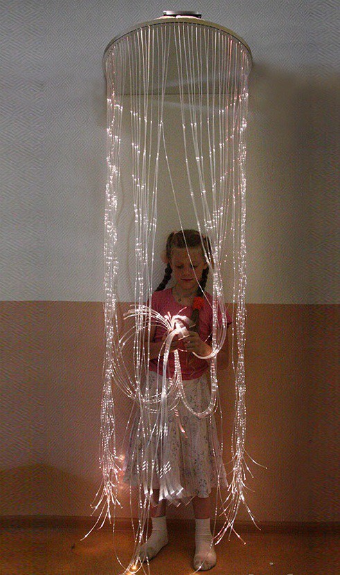 Несущая настенная конструкция выполнена в виде козырька домика, с которого свисают светящиеся фибероптические нити. В домик можно зайти и спрятаться от окружающего пространства. Крепление настенное. Количество нитей: 60.