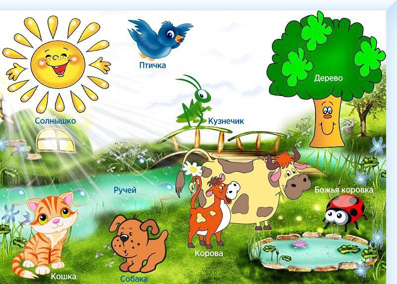 Под каждым элементом находится надпись с названием. При прикосновении к солнышку - загорается солнышко, при прикосновении к дереву - светится само дерево. При прикосновении к животному, насекомому или птице - вы услышите звук, издаваемый данным существом. При поглаживании ручейка Вы услышите журчание воды.