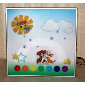 Световая панель "Аудиорадуга" имеет размеры 35х35см . Выполнена из ударопрочного пластика. Питание от трех батареек. Кнопка включения-выключения - на торце панели. На лицевой панели расположены 7 кнопок - семь цветов радуги.  При нажатии кнопки с указанным цветом радуги - радуга загорается определенным цветом и раздается голос "радуги" , которая озвучивает выбранный цвет. Звуковую функцию можно отключать.  При прикосновении к глазкам собачики - загораются глазки. При прикосновении к солнышку - подсвечивается солнышко. При прикосновении к облачку - загорается облачко. Данная панель помогает выучить основные цвета, развивает воображение, причинно-следственные связи.
