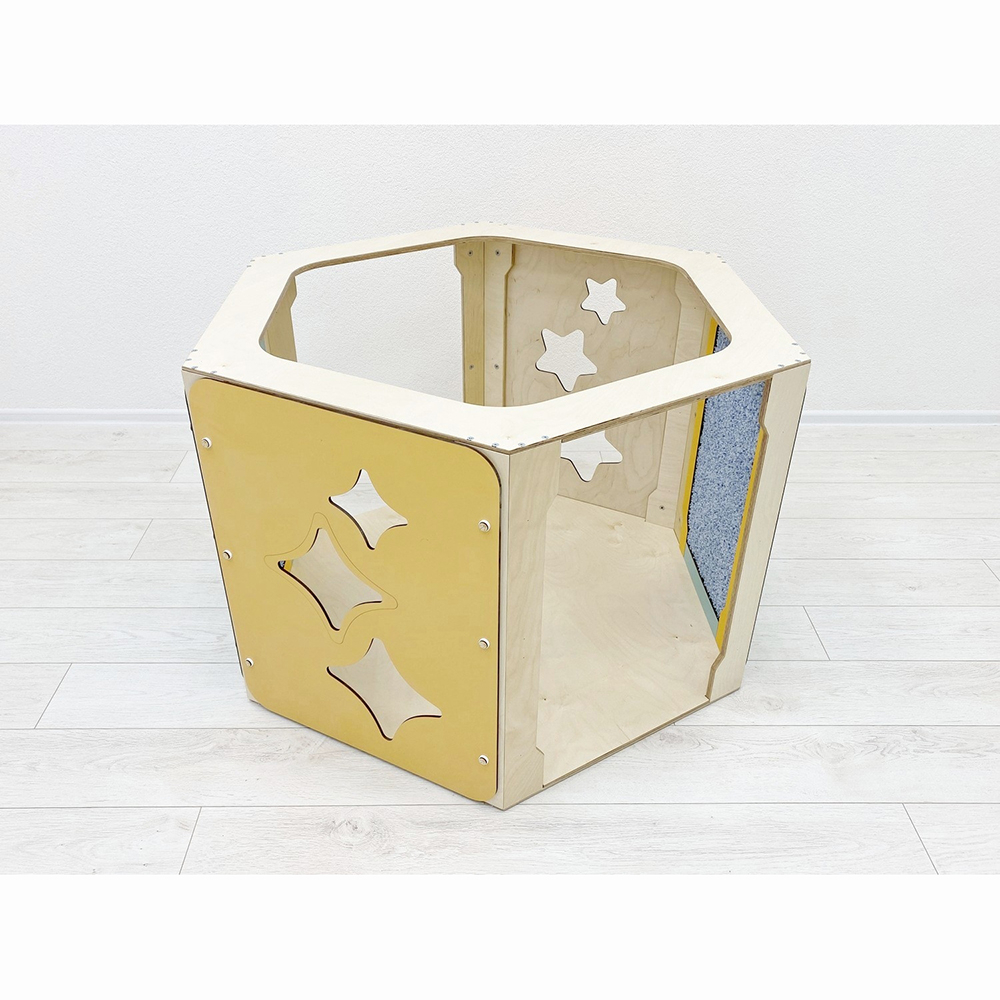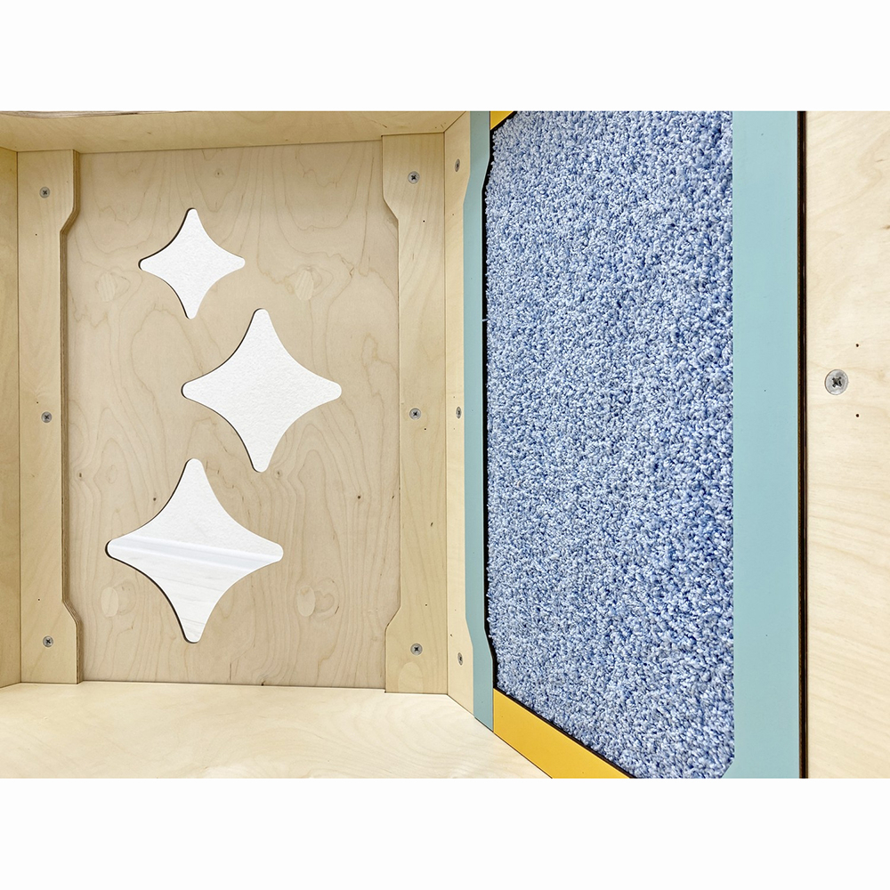 Внутри модули украшены тактильными панелями для развития сенсорной чувствительности, а снаружи – лазерной гравировкой и фигурными окошками. Они идеально стыкуются между собой и позволяют конструировать из них замки и лабиринты для маленьких непосед.