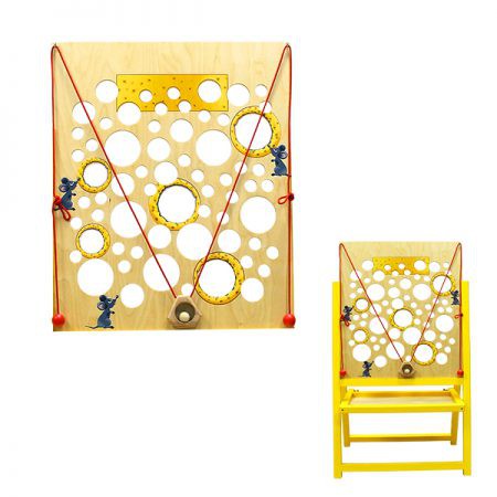 Игровая задача – «Мышка» – корзиночка, подвешенная на двух шнурах, должна пройти снизу вверх по всей площади «сыра с дырочками». Управляя качающейся при движении корзиночкой, игрок должен попытаться не уронить лежащий внутри шарик или деревянное колечко. (Возраст – с 5-ти лет).