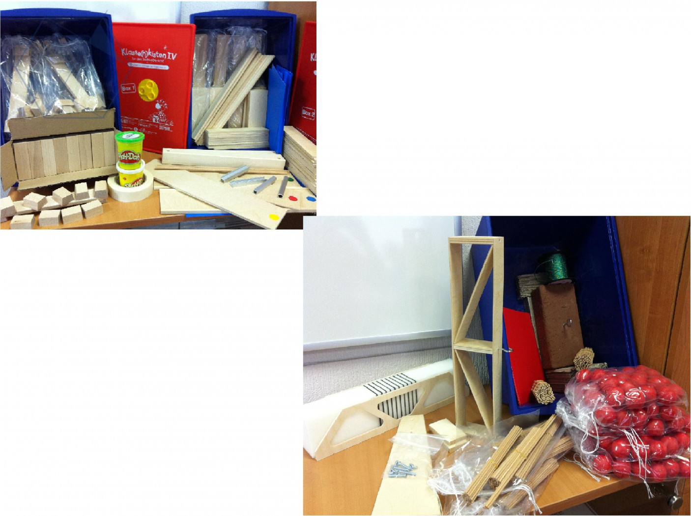 В комплекте (для группы до 32 детей)* 3 коробки с большим количеством высококачественных универсальных деревянных деталей, из них: более 100 деревянных брусков, около 400 круглых деревянных палочек, 65 длинных и коротких деревянных реек, 34 тонких и толстых дорожных полотна, опорные планки, 8 арочных мостов на подставке и модель каркасного моста из дерева отрезки профиля из металла, моток клейкой крепежной ленты, мягкая пластилиновая масса и др.