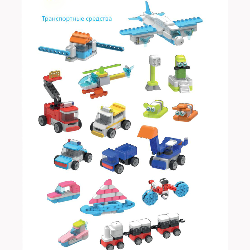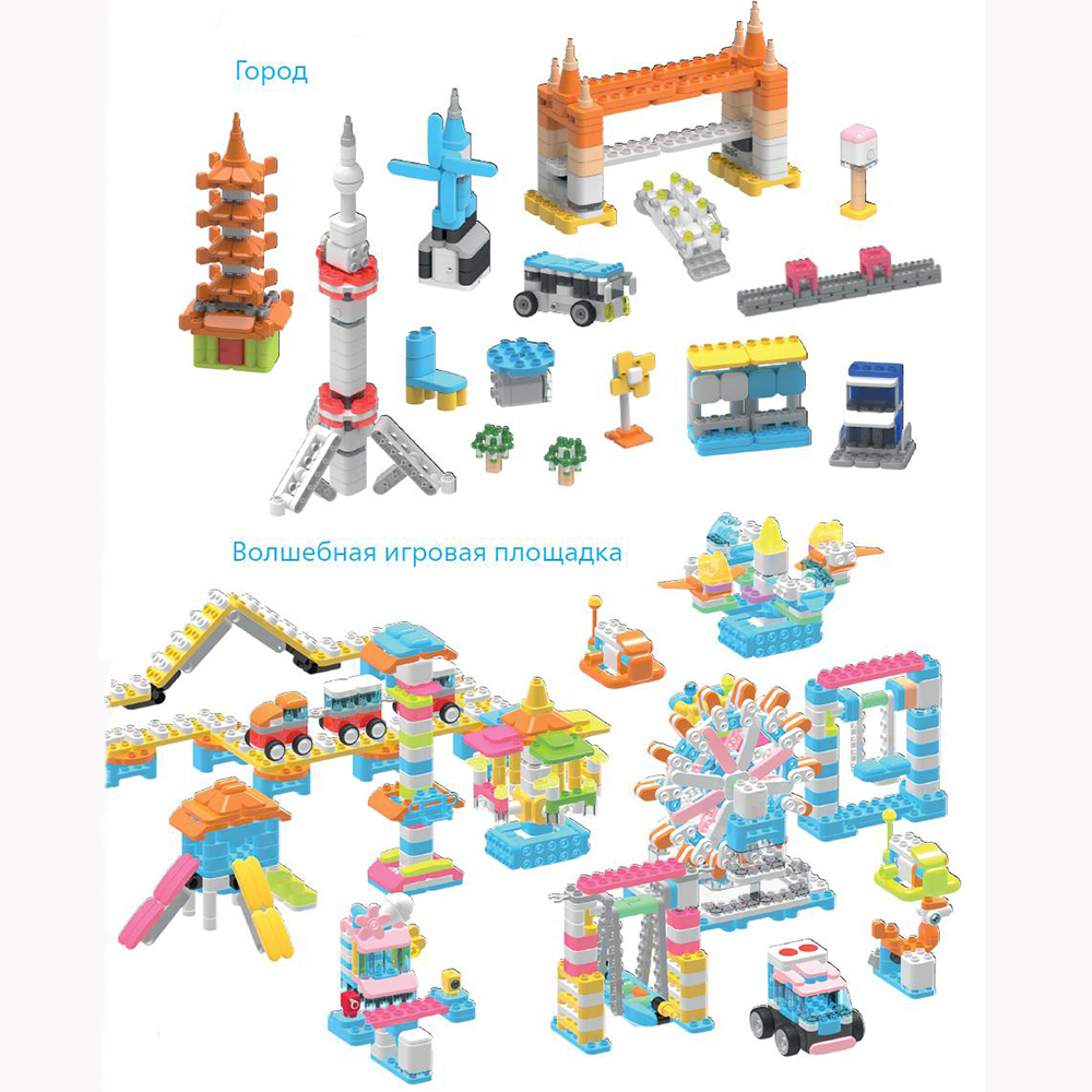 Набор пластмассовых блоков конструктора для строительства содержит 4 тематических набора: