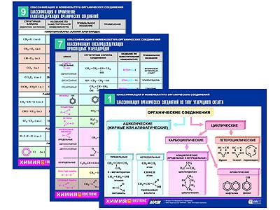 Комплектность: "Классификация органических соединений по типу углеродного скелета", "Окончания в названиях органических соединений", "Заместительная номенклатура органических соединений (Женевская) (1)", "Заместительная номенклатура органических соединений (Женевская) (2)", "Углеводородные радикалы", "Классификация и номенклатура углеводородов", "Классификация кислородсодержащих производных углеводородов", "Классификация азотсодержащих органических соединений", "Классификация и применение галогенсодержащих органических соединений", "Классификация природных органических соединений (1)", "Классификация природных органических соединений (2)", "Нуклеиновые кислоты", "Генетическая связь органических соединений", "Виды структурной изомерии органических соединений", "Виды пространственной изомерии органических соединений", "Природные жирные кислоты и их источники".