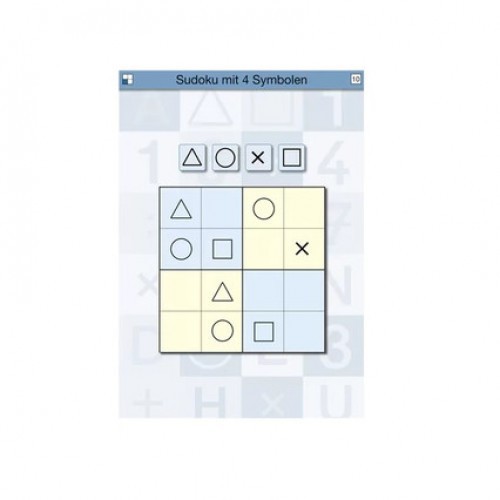 Комплект карточек многоразового использования с известной головоломкой простейшего уровня, составленных из квадратов на 4 и 6 символов. В верхней части каждой карточки указаны все символы, цифры или буквы, необходимые для решения головоломки. Игровая задача - заполнить свободные клетки так, чтобы в каждой строке, в каждом столбце и в каждом квадрате каждый элемент встречался бы только один раз. Карточка с игровой задачей вкладывается в планшет с прозрачной пленкой, на которой можно писать недостающие символы, буквы или цифры фломастером на водной основе, стираемым сухим ластиком. Неверные варианты можно вычеркивать или стирать, при этом игровые карточки остаются чистыми. На обратной стороне карточек – решение задачи; перевернув карточку под пленкой можно сравнить свой вариант с правильным решением. Уровень предлагаемых заданий постепенно усложняется. В комплект входят также пустые карточки для составления собственного варианта Судоку. Игровое пособие развивает мышление, логику, усидчивость.