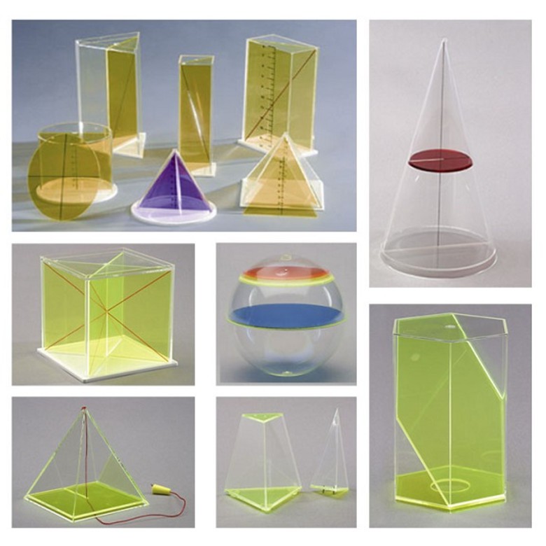 В наборе 12 полых прозрачных геометрических тел со съемными сечениями, в том числе призмы прямоугольные, квадратные, 3- и 6-гранные, пирамиды 3- и 4-гранные, тетраэдр, куб, цилиндр, конусы, разборных на 3 части шар (сфера).