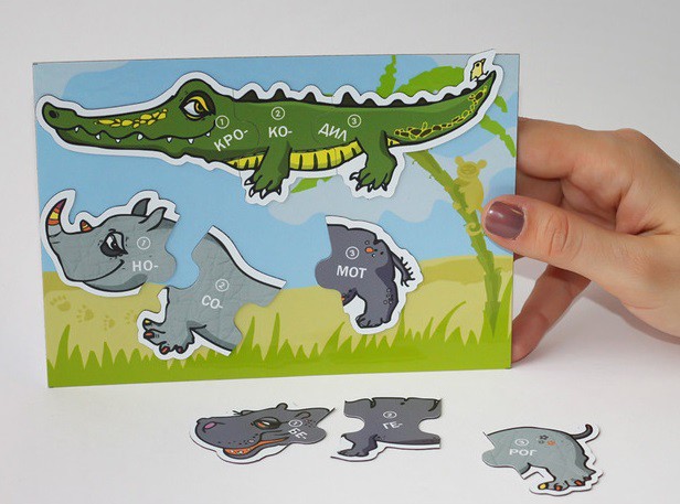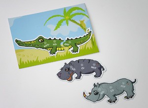 На поле нарисована жаркая Африка, в которой живут разные звери. Например, бегемот, крокодил, носорог. В нашем варианте каждый из них состоит из трех частей. Мальчики и девочки должны правильно собрать этот забавный конструктор так, чтобы бегемот не был похож, допустим, на крокодила, а у носорога остался собственный, а не чужой хвост.