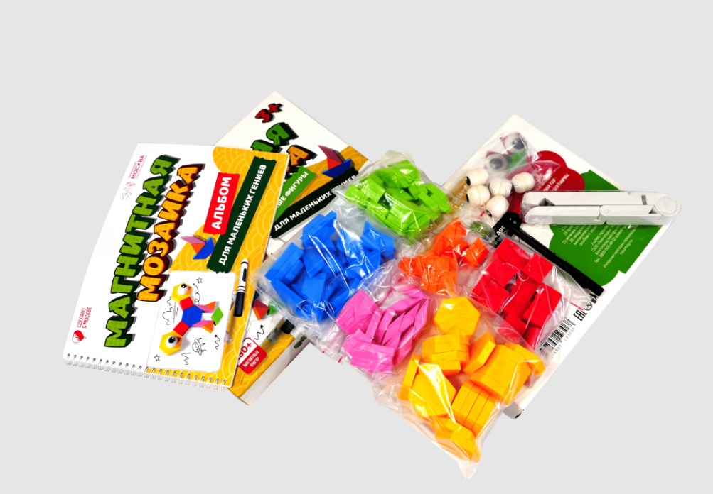 Магнитная мозаика состоит из 150+ элементов, которые можно использовать для создания различных картинок. Элементы выполнены из качественного пластика, металла и магнита, что обеспечивает их долговечность и безопасность для детей.