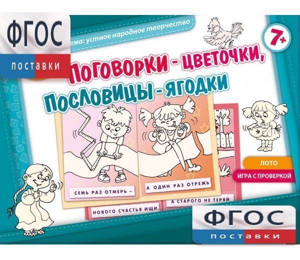 В игру входят 28 русских пословиц. Материала для осмысления много, можно знакомиться с ним постепенно. Поиграйте сначала с пословицами, доступными для понимания ребенка. Приобщение к народной мудрости не терпит суеты. Каждая пословица достойна внимания. Поговорите о прямом и переносном её значении, о сюжетной картинке нашего лото. Вспомните о других известных пословицах на эту же тему.