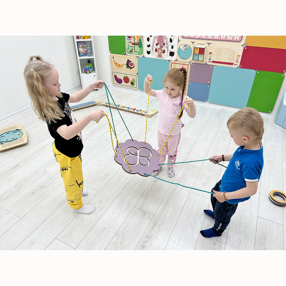 Командная нейровосьмёрка – игровая доска-лабиринт, которой нужно управлять в команде из четырёх человек. Малыши берутся за шнуры, каждый со своей стороны, и наклоняют доску в разные стороны, чтобы металлический шарик прокатился по нужной траектории. Развивает командный дух и совместное взаимодействие.