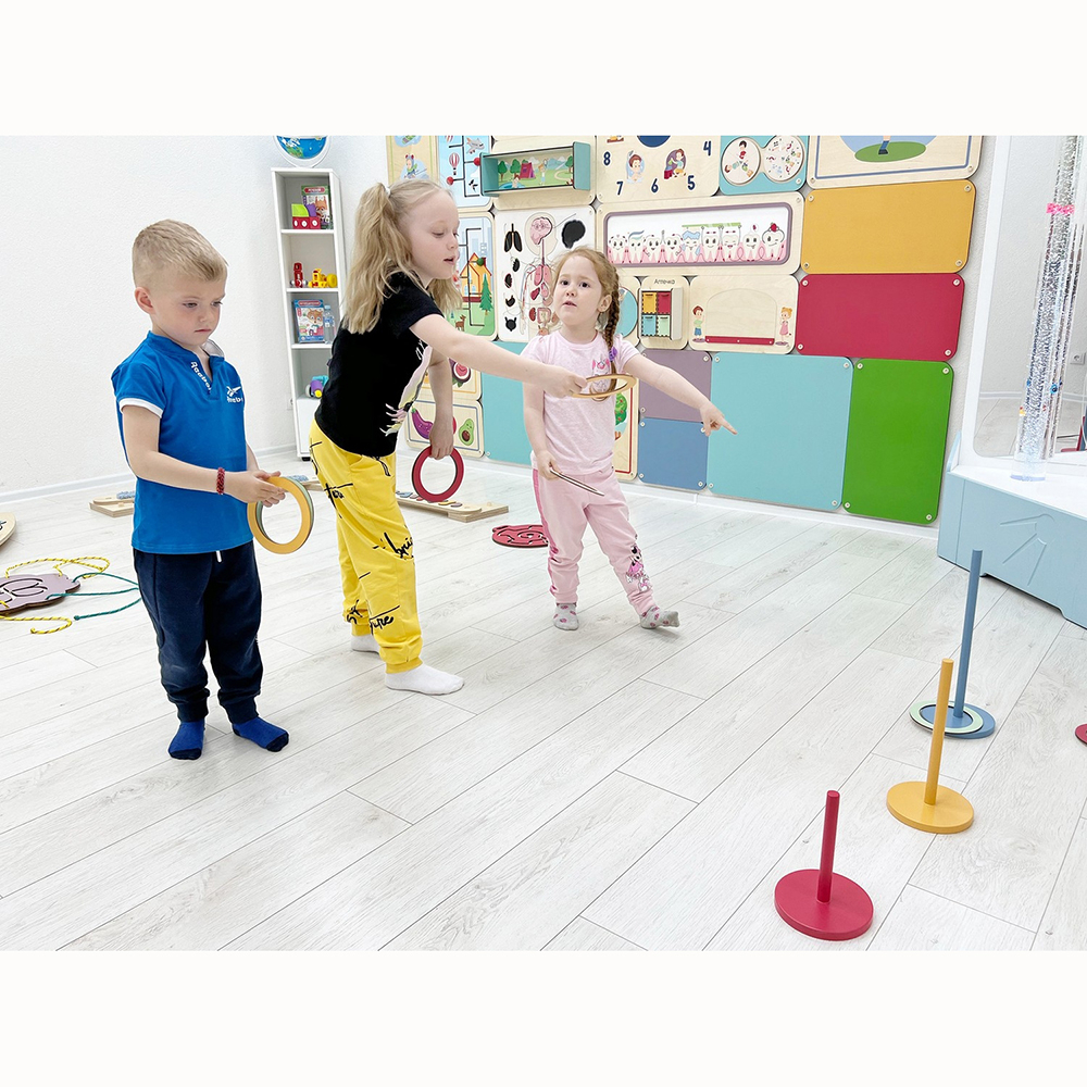 Кольцеброс – традиционная игра на развитие ловкости, меткости и глазомера. Состоит из трёх цветных колышков разной высоты и комплекта колец, которые нужно накинуть на эти колышки с определённого расстояния.
