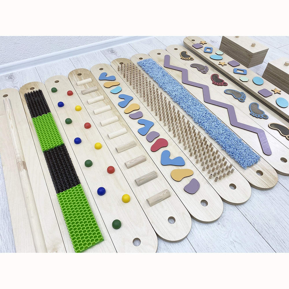 Сенсорные балансировочные мостики – конструктор из 10 троп, 10 брусков и 2 стартовых блока, применяется для развития равновесия, координации движения, профилактики сколиоза и плоскостопия у детей. Разный рельеф и материал покрытия мостиков служит развитию сенсорной чувствительности и стимуляции рефлекторных точек на ногах.