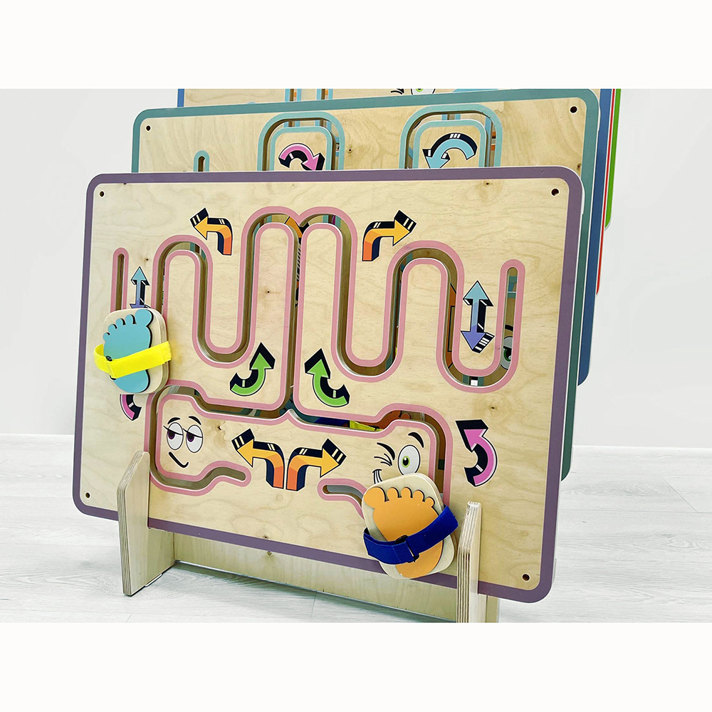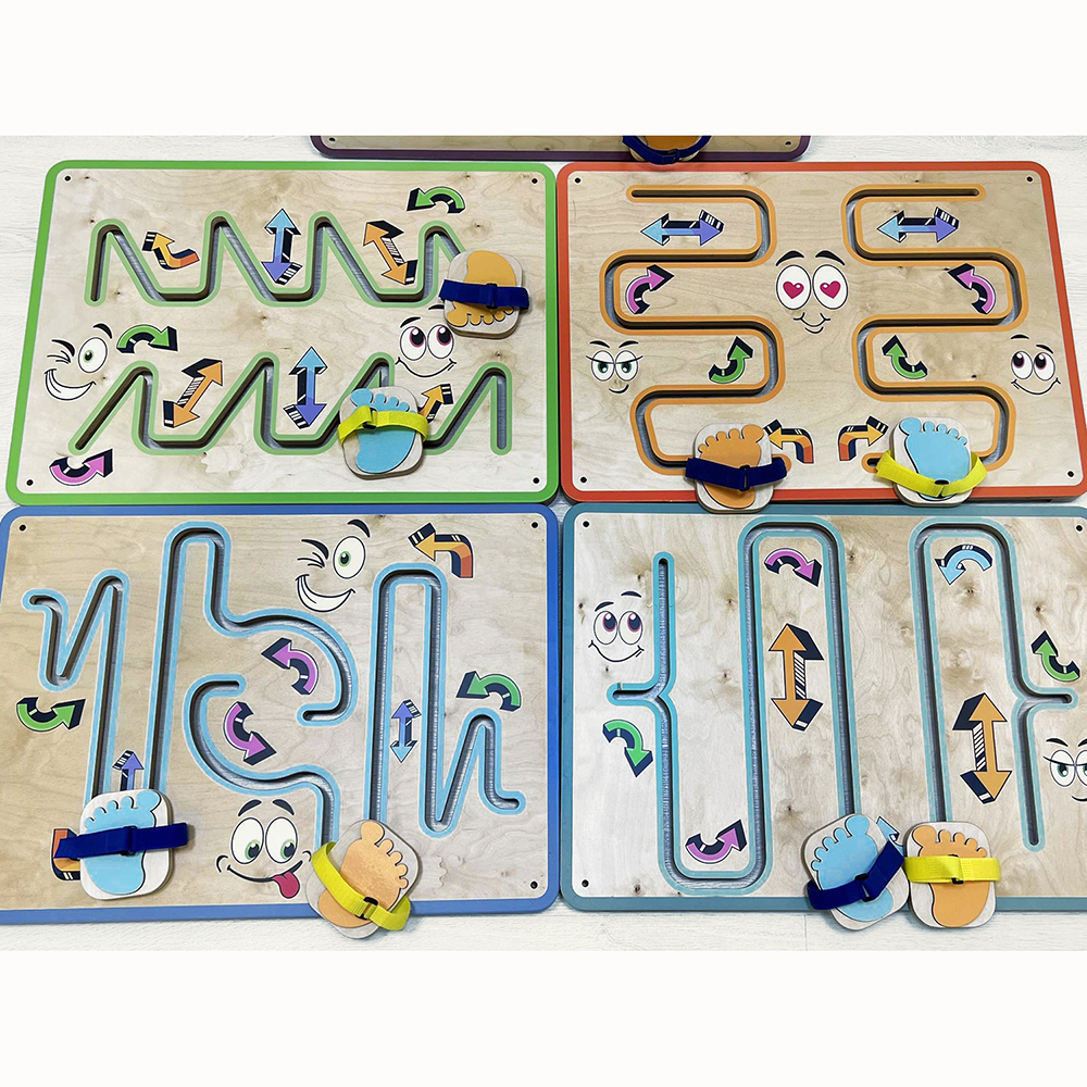 Платформа «Ногоборда» закрепляется на стене, дети садятся на пол, вставляют стопы в специальные крепления на подвижных бегунках и передвигают эти бегунки по лабиринту.