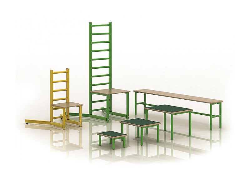 - Скамейки-вкладыши имеют разную высоту, используются для тренировки силы ног, координации, равновесия, внимательности.