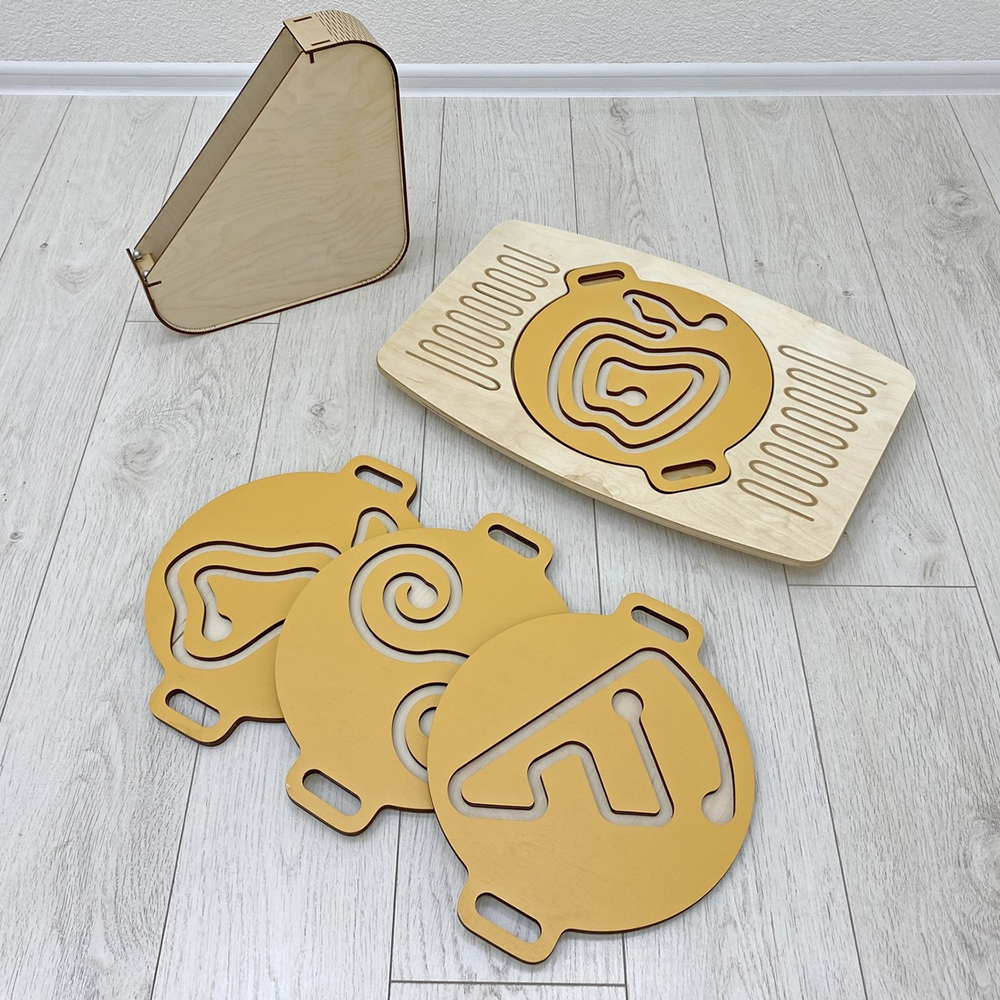 Благодаря заменяемости лабиринтов, игрушка просто универсальна! Дети могут играть отдельно с ручными лабиринтами или вставить их в балансир для ног и соревноваться в ловкости и скорости прохождения.