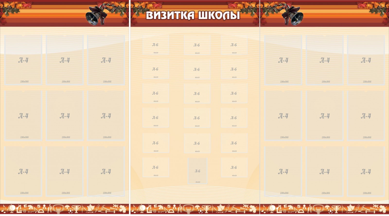 Оригинальный стенд «визитка школы» может включать в себя информацию или фотографии отличившихся учителей и учеников. Стенд имеет 18 карманов для документов формата А4, а также 18 секций для фотографий размером 10х15. Такой стенд имеет приятный дизайн, выполненный в бардовых тонах и других оттенках красного. Удобное распределение карманов позволит немного пофантазировать и распределить фотографии по центру, а информационные листы по бокам. Эта модель горизонтального стенда украсит коридор, а также позволит ученикам и учителям знать о достижениях и отличиях учебного заведения.