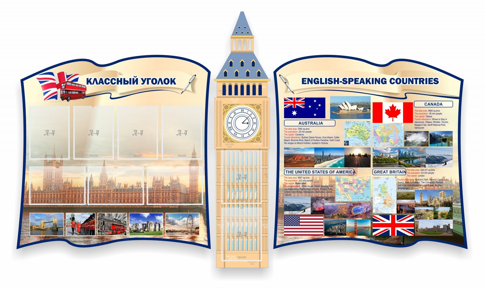 Левую сторону стенда дополняют прозрачные карманчики формата А4 для сменной информации, правая часть - ярко проиллюстрированный коллаж об основных символах англоязычных Австралии, Канады, США и Великобритании.