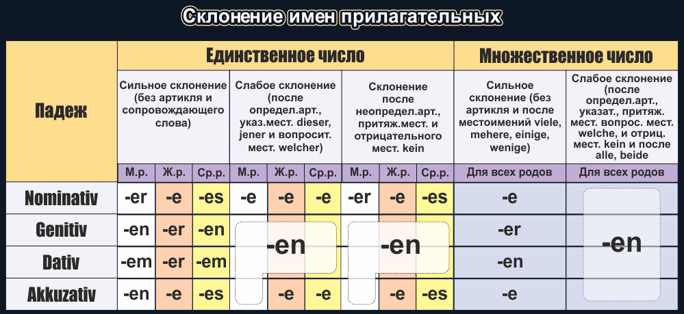 Каждый язык по-своему хорош и необычен. Бытует мнение, что сложнее всего, изучить именно русский язык, но на самом деле, это довольно-таки спорное мнение. И утверждением называть его, точно уж не стоит. Стенд с приятным для глаз дизайном, несмотря на включение нескольких оттенков, не повлияет на появление несерьезного отношения, со стороны учеников, к этой важной таблице. Очень удобно, что вся табличка включает не только немецкие, но и русские слова. Так детям будет проще сориентироваться с тем, что же им нужно запомнить. Склонение имен прилагательных имеет огромнейшее значение. Собственно, как и в любом другом языке. Это всего лишь основы основ, которые нужно знать каждому школьнику. Ведь выучить немецкий язык, предлагается не Маугли, а современным детишкам из обыкновенных городов.