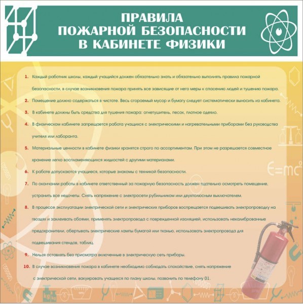 На уроках физики учителя часто демонстрируют разные опыты, а также практические работы, которые могут привести к возгоранию, а также к любым пожароопасным ситуациям, и виной этому зачастую бывает не только ученик, но и учитель. Поэтому, чтобы преподаватель и учащиеся во время урока были в полной безопасности, необходимо знать технику по пожарной безопасности и действия, которые следует принимать в случае возникновения возгорания. Стенд «Правила пожарной безопасности труда в кабинете физики» помогает учителю всегда напоминать ученикам о пожарной безопасности при опытах в кабинете физики.