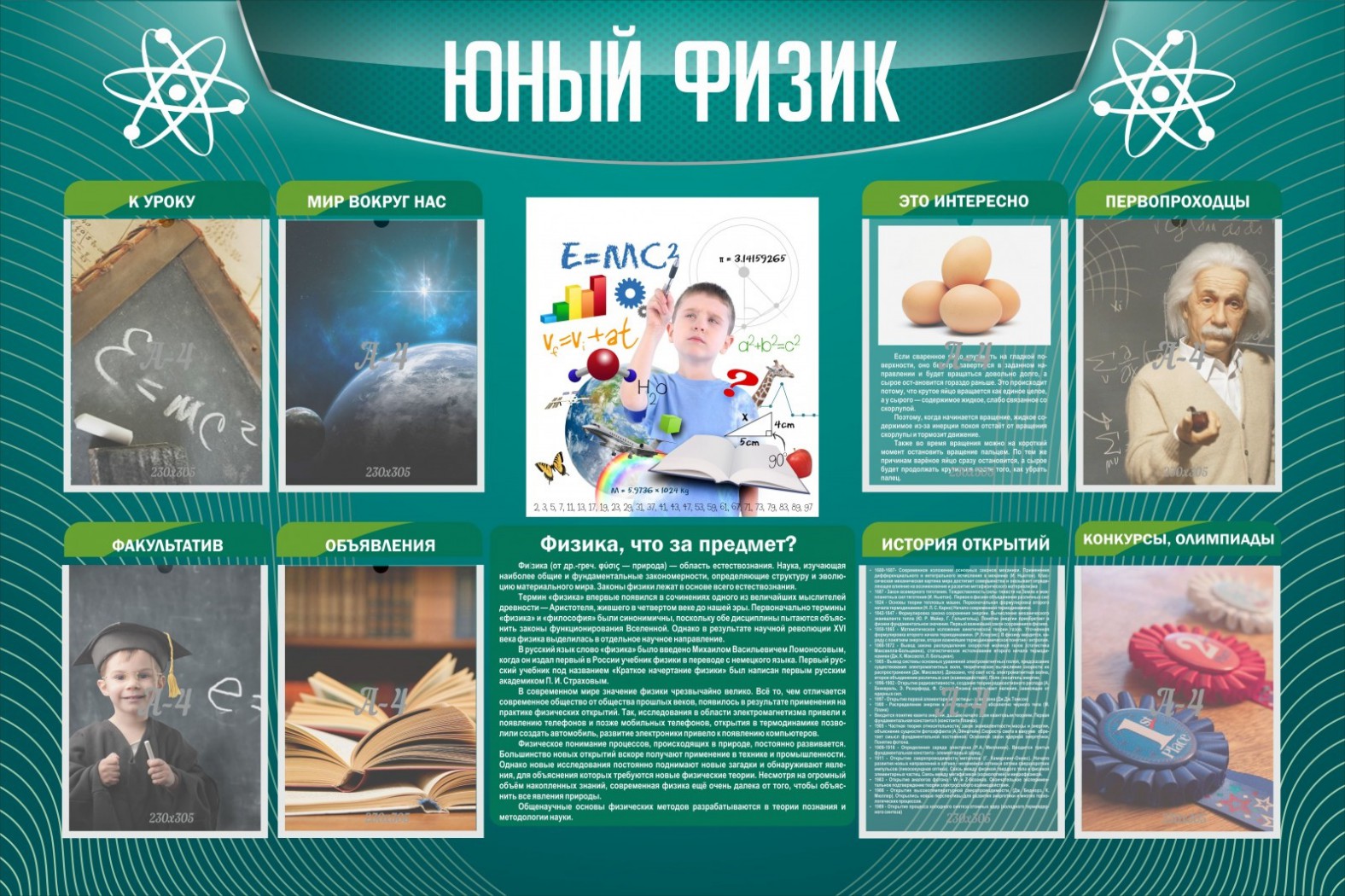 Информационный стенд «Юный физик» выполнен именно для тех, кто интересуется физикой и хочет узнать о ней больше. На стенде показаны красочные картинки, относящиеся к физике — мир вокруг нас, первопроходцы, история открытий и многое другое интересное и познавательное для учащихся. Стенд позволяет посмотреть на физику немного с другой стороны без сложных формул и вычислений, представляя ее как увлекательное путешествие с раскрытием неизвестных фактов, стимулируя у школьника интерес к физике желание изучать ее более подробно. Для привлечения большого количества желающих заинтересоваться углубленным изучением предмета стенд стоит располагать в более проходимых местах школы.