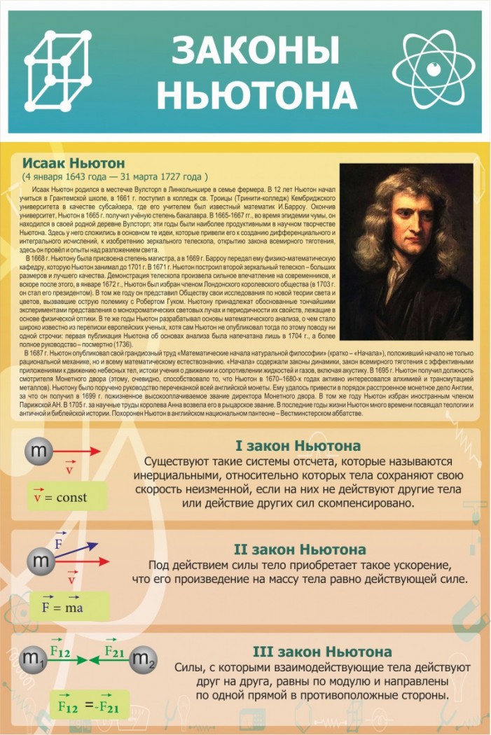 Физика — это современная наука, на развитие которой в свое время оказал большое влияние всем известный ученый Исаак Ньютон. Стенд «Законы Ньютона» описывает историю из жизни Ньютона, а также предоставляет учащимся три закона, которые он создал. На стенде изображена качественная фотография великого ученого, благодаря которой учащиеся могут знать Ньютона в лицо, а грамотно оформленный фон позволяет лучше разбираться в таком предмете, как физика. Стенд сделан из качественного материала пластика, который без проблем крепится на двухсторонний скотч или небольшие саморезы на любую поверхность стены.